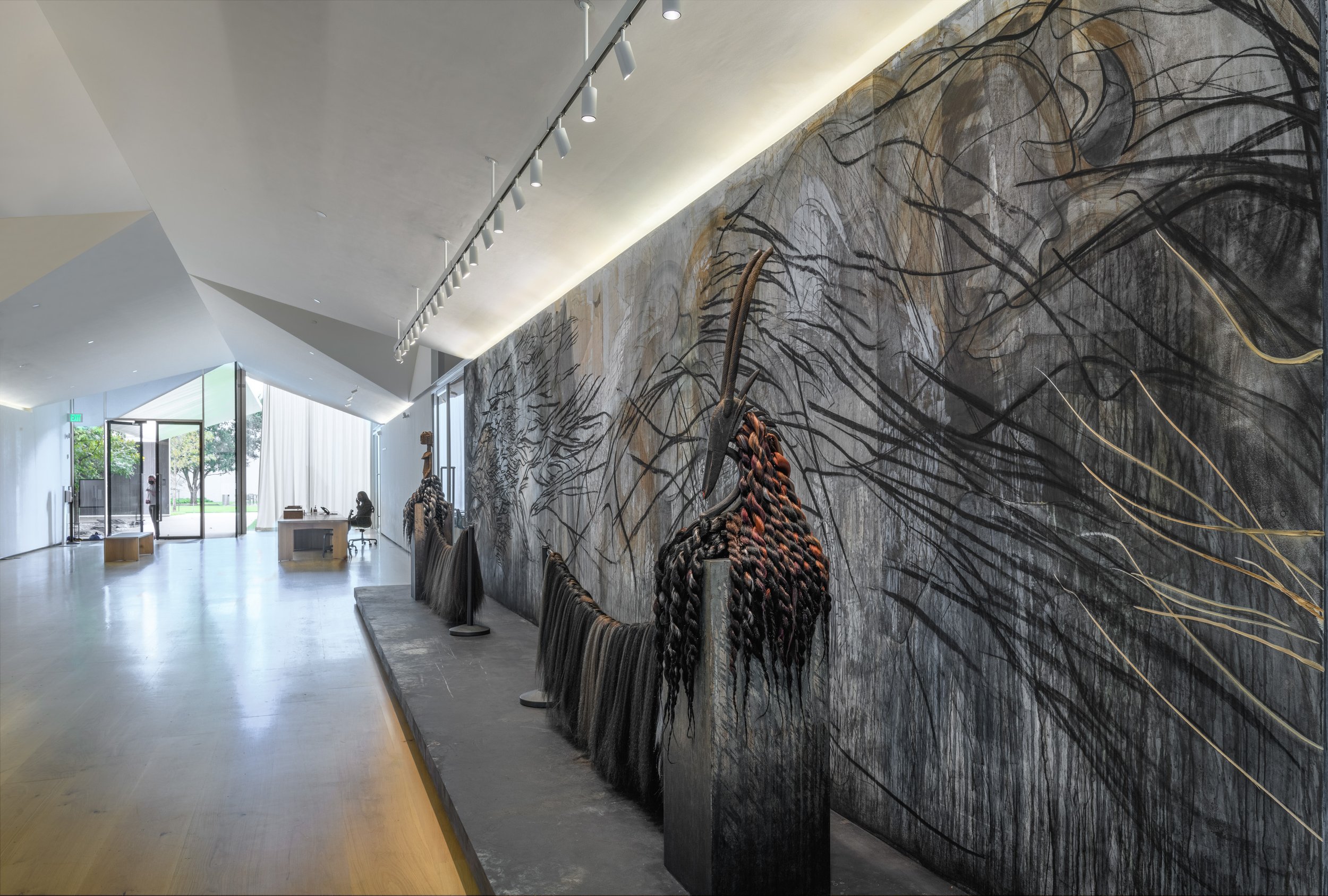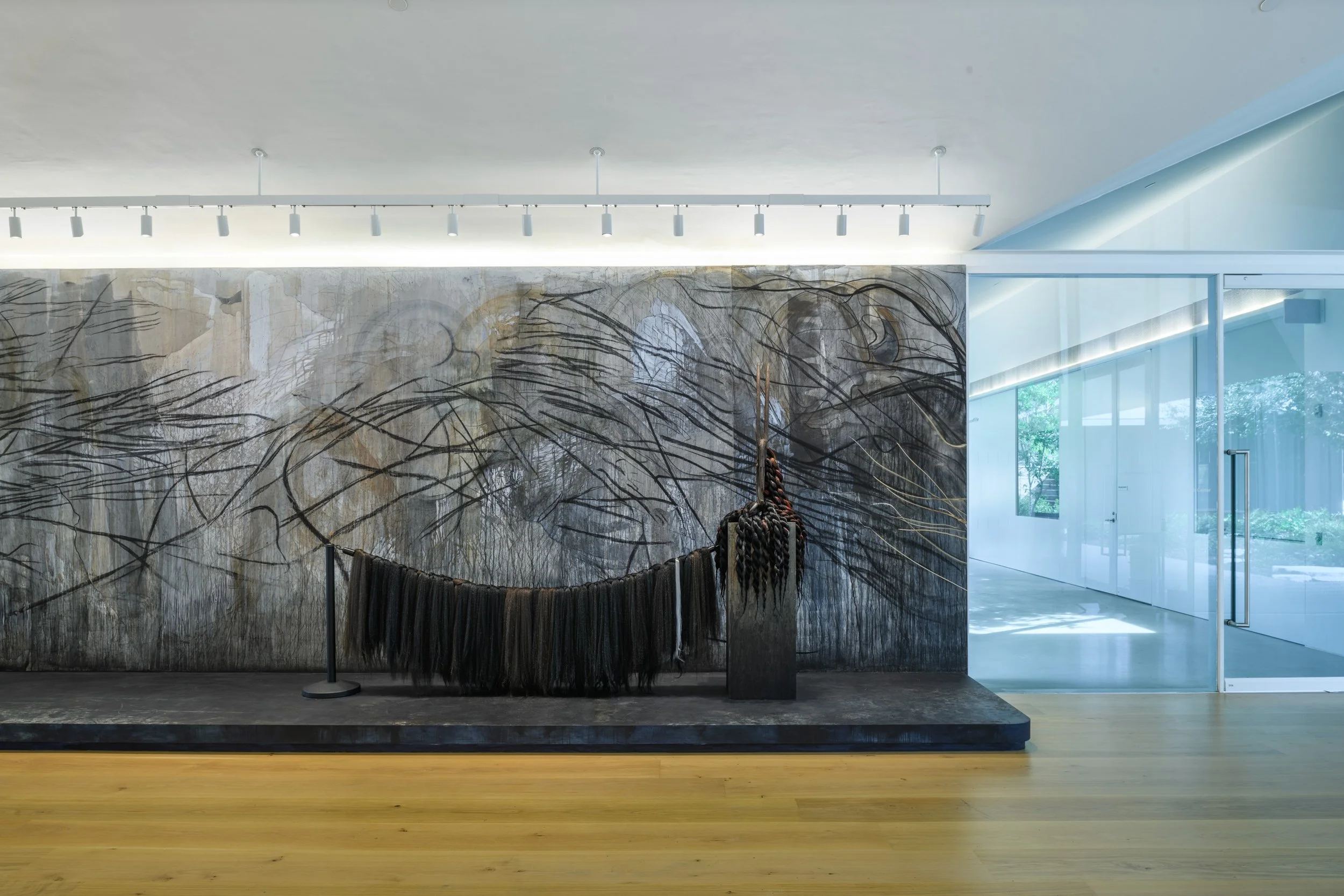 In 2021, I was commissioned to create a site-specific wall drawing for the Menil Drawing Institute in Houston. The installation spanned thirty-six feet across a threshold wall, unfolding through a layered field of materials: charcoal, indigo and kola nut pigments, tea, acrylic, biochar, digital print, synthetic hair, and two carved figures. It operated as a material, historical, and conceptual system whose full force required the viewer's movement through space.