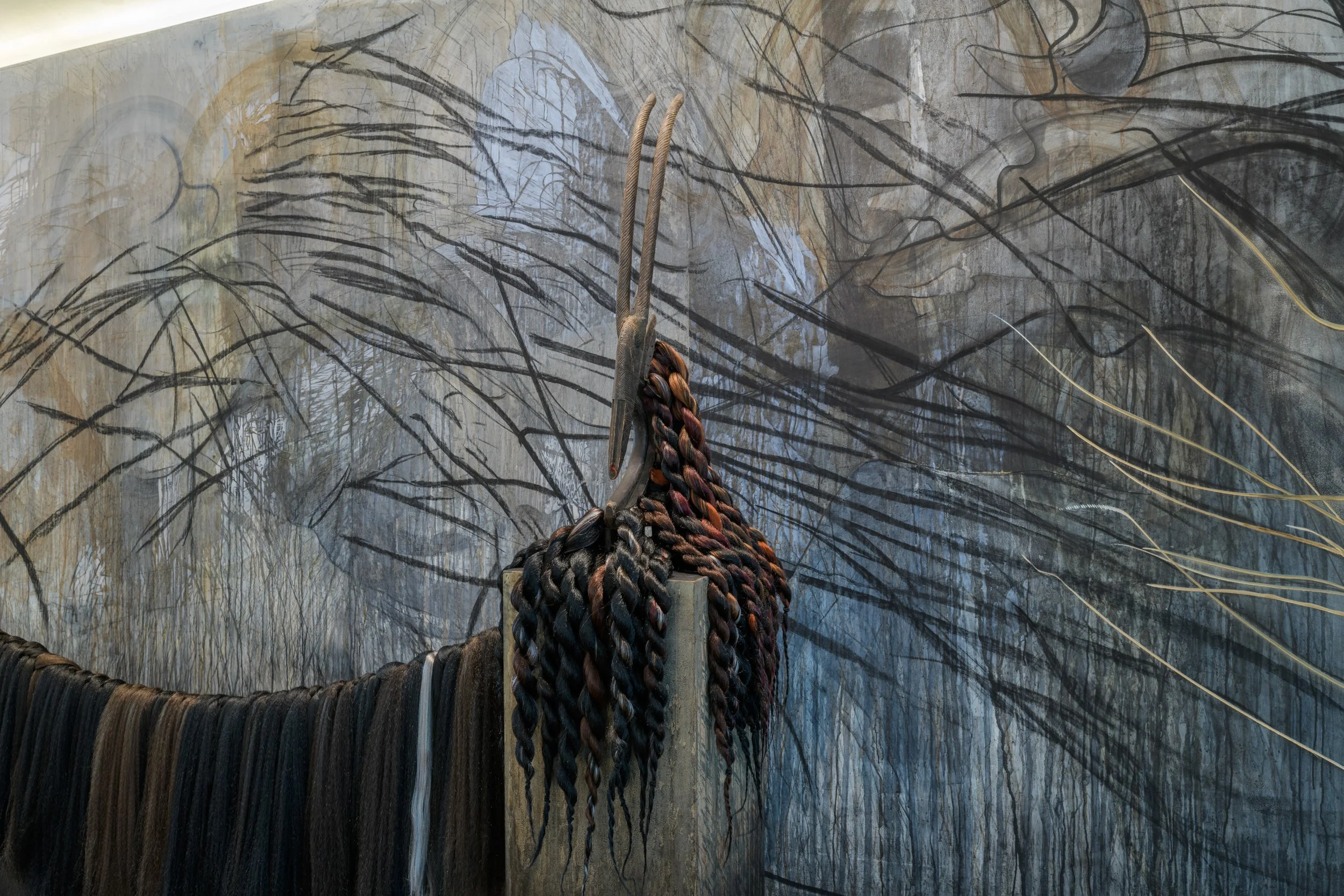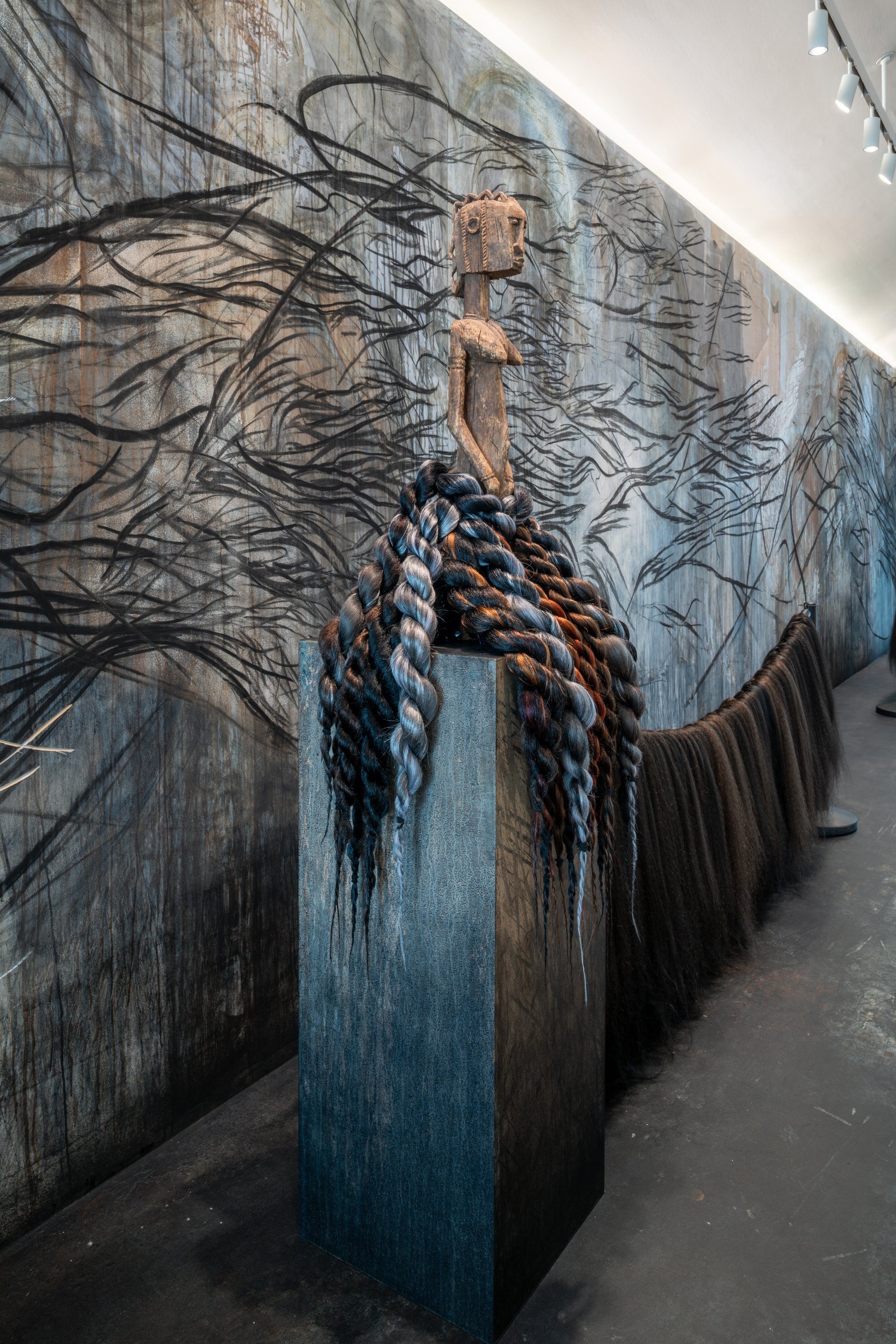 Pigment marks, hair stretches, wood bears. The viewer turns a corner, and the system shifts. Meaning is not deposited in advance; it emerges through encounter, through the viewer's passage across a field that is always only partially present to itself. There is no center from which this movement can be organized. The line does not begin or end; it branches, folds, disappears, and resumes elsewhere. Structure unfolds laterally. The sculptural figures extend this logic into space, forming provisional links across materials, time, and bodies. Some lines terminate; others diverge without conclusion. The wall holds these ruptures without reconciling them.